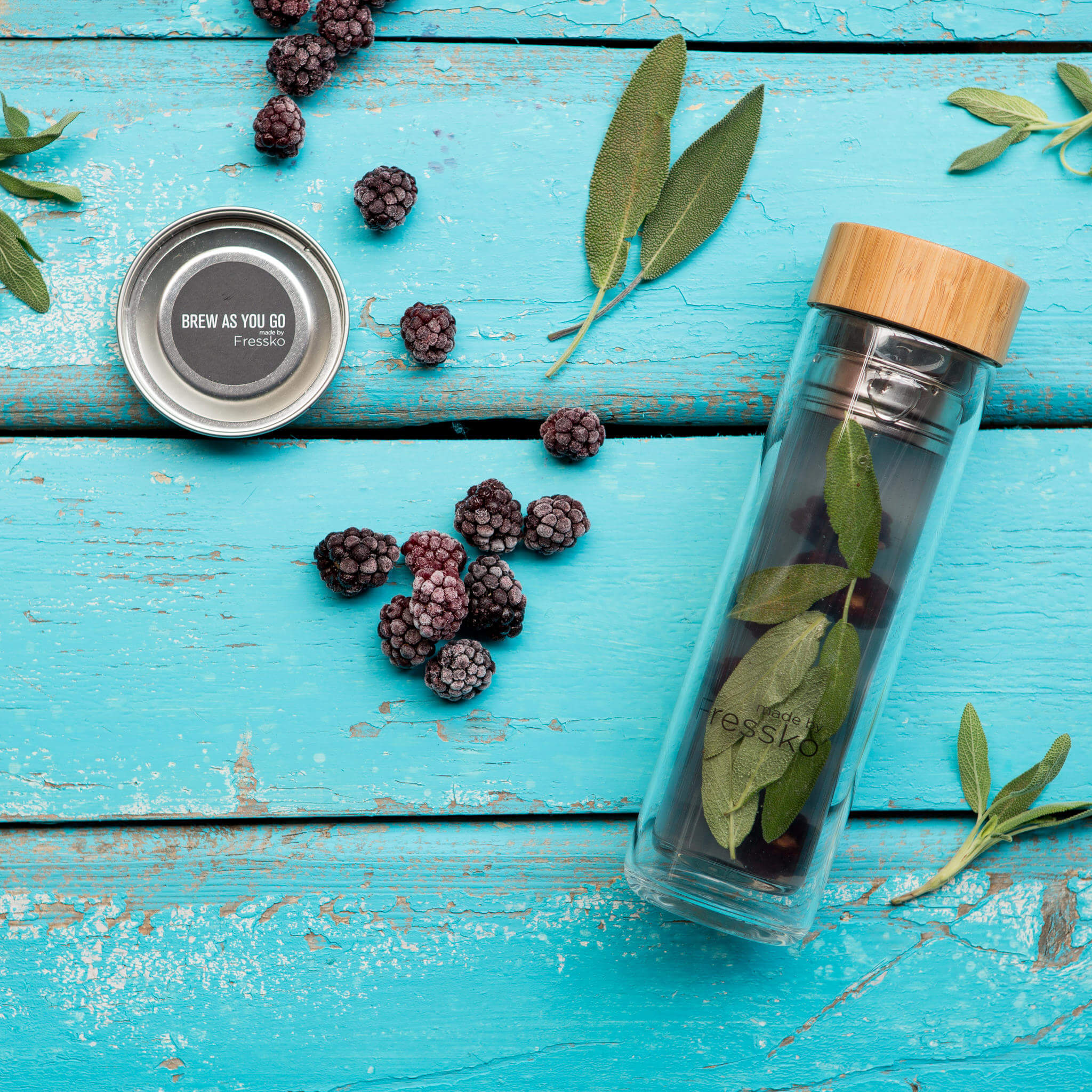 Use top filter attachment to hold in blackberries and sage as you drink. Enjoy!