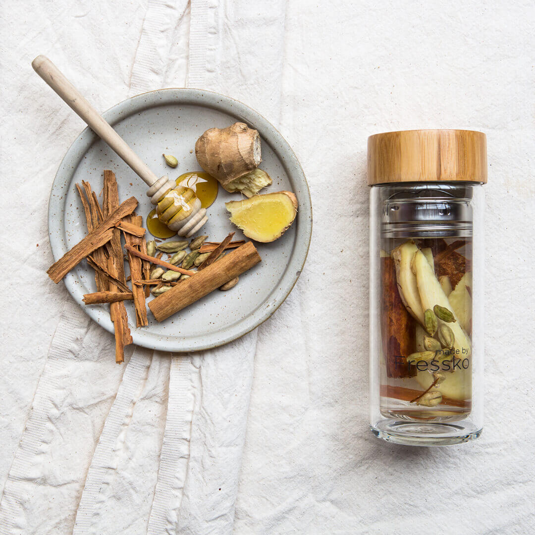 Use top attachment of tea infuser to hold aromatics in as you drink.