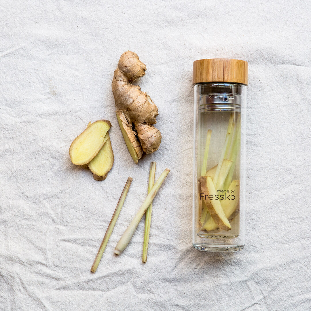 Screw in the top part of the 2 in 1 infuser (this keeps the bits of lemongrass and ginger in the flask while you sip).