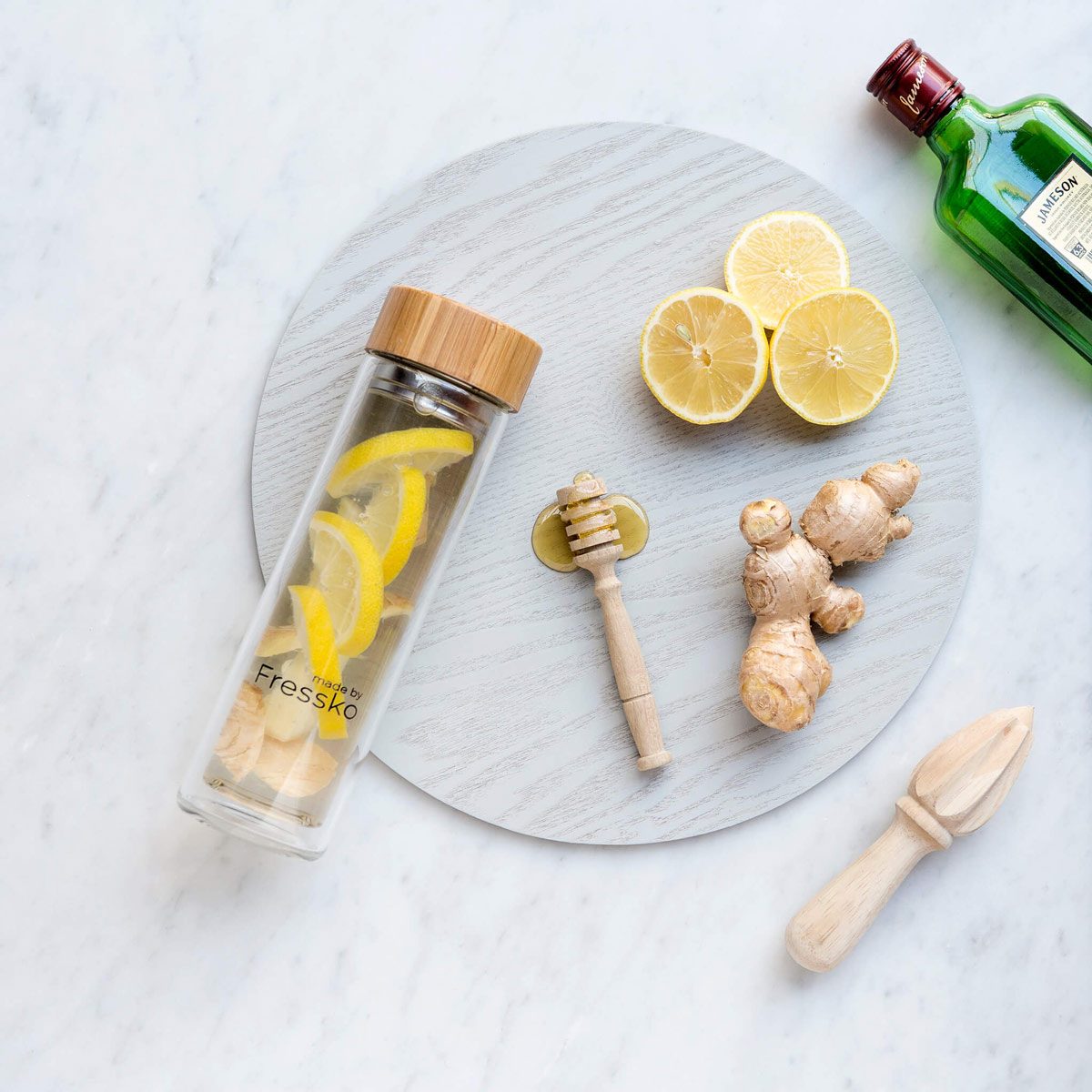 Alternatively squeeze juice from lemon into flask with a wooden citrus reamer.