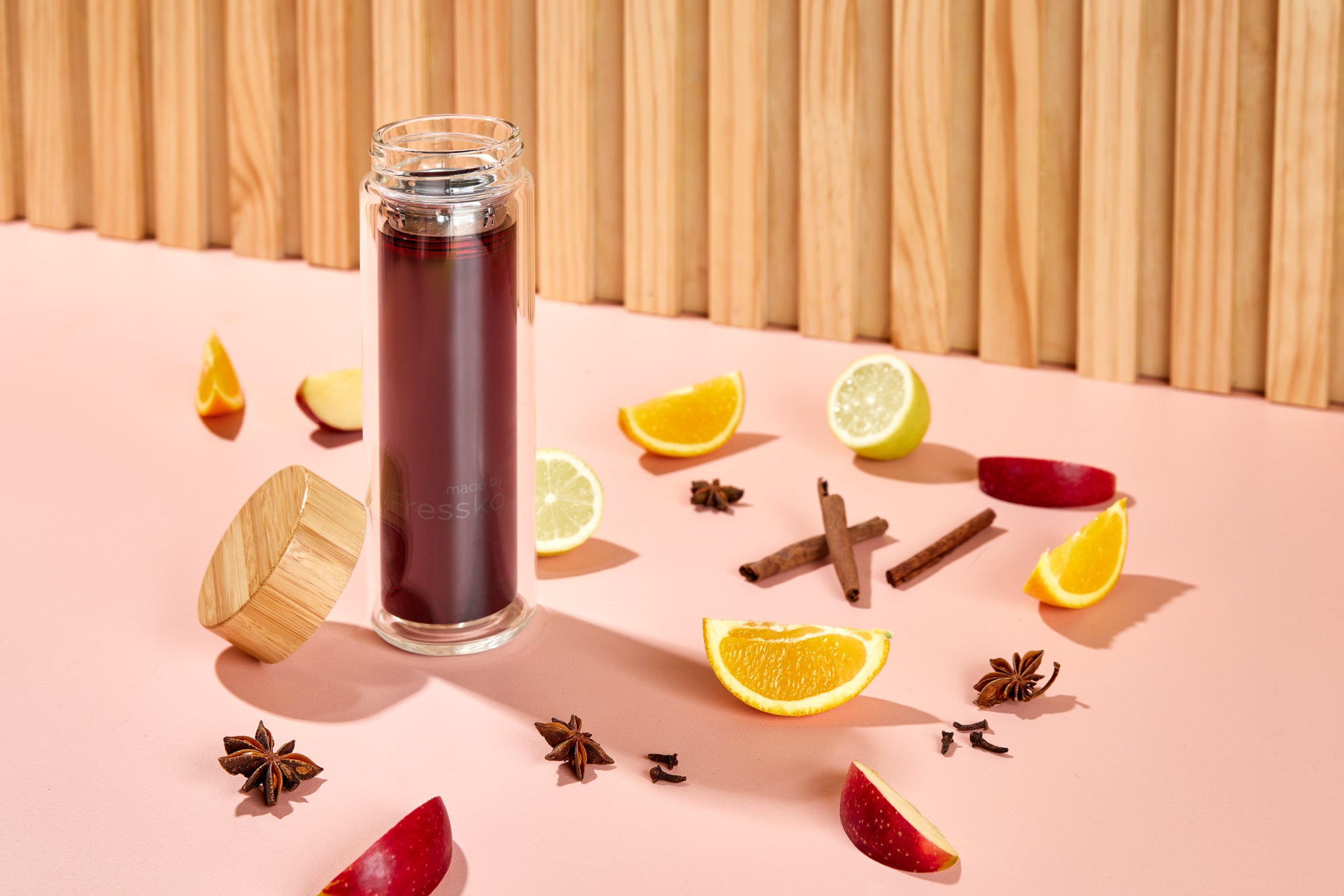 Using a soup ladle, add liquid to your Insulated Fressko flask along with a few apple pieces.