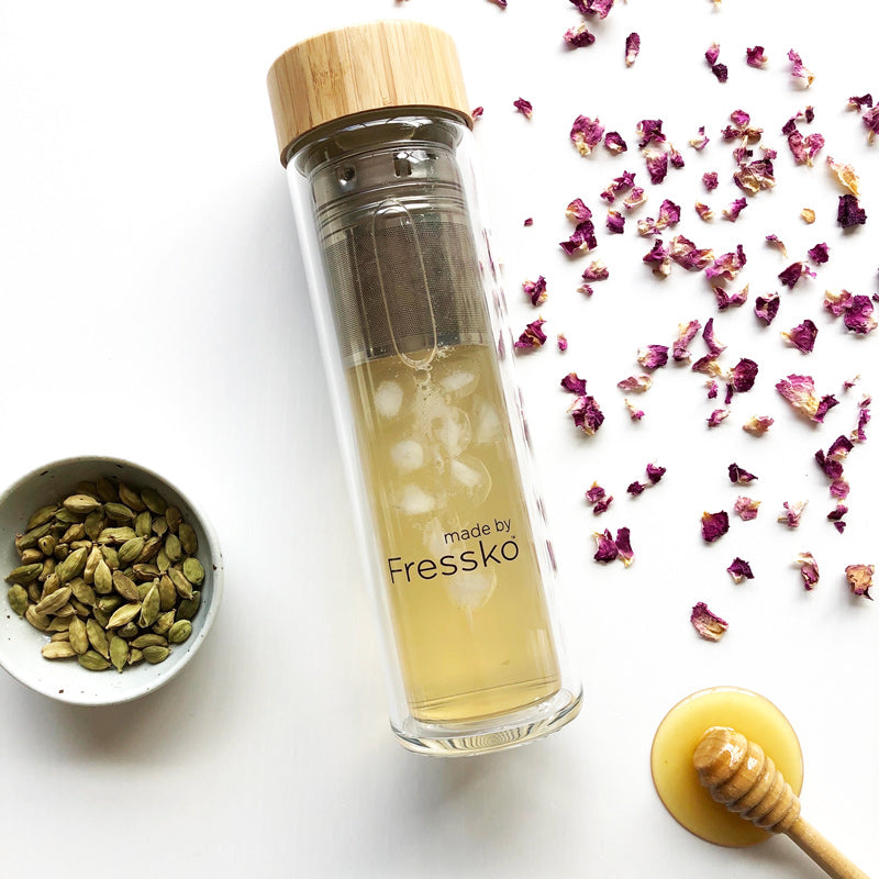 Add rose petals and bruised cardamom pods to infuser and pop into flask.