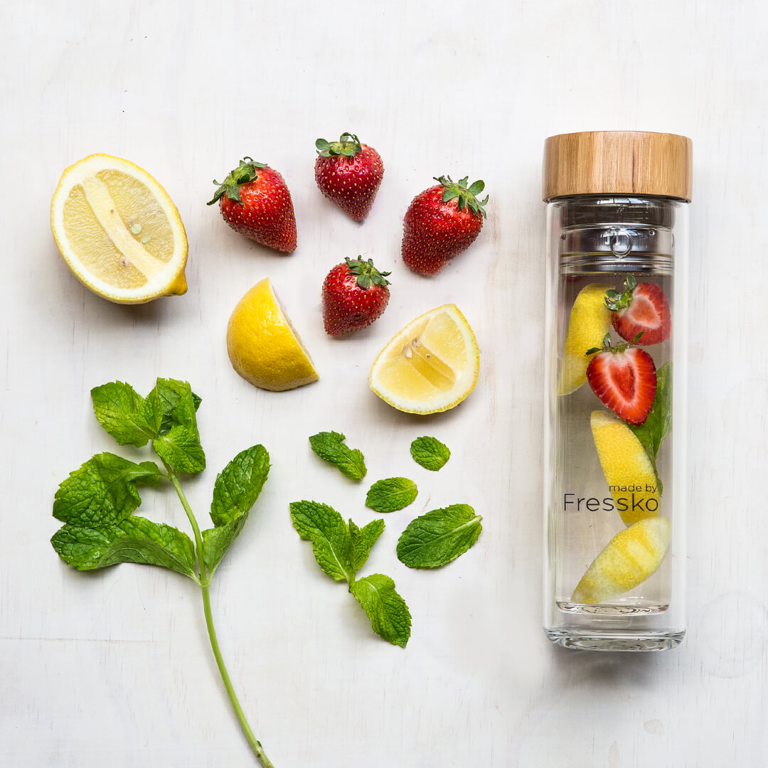 Use top attachment of tea infuser to hold in fruit and mint as you drink.