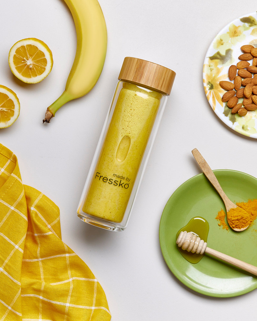 Blend all turmeric smoothie ingredients together. Pour into a your Fressko flask.